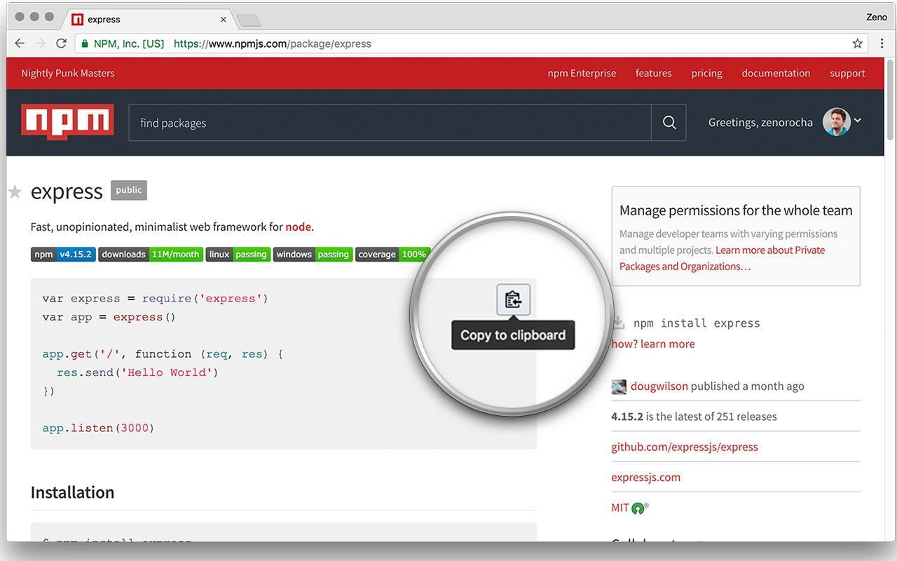 With that in mind, I decided to create a browser extension that adds a copy to clipboard button on every code snippet. It's very simple, yet super useful.